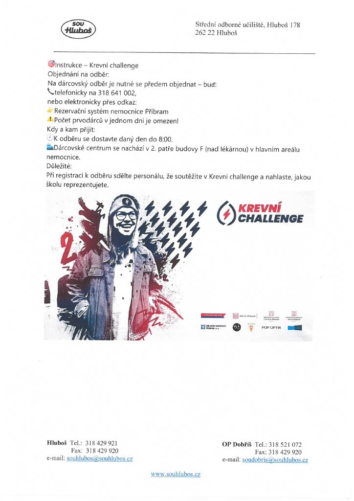 Naše škola se zapojila do projektu KREVNÍ CHALLENGE, pořádané příbramskou nemocnicí. Jedná se o soutěž v darování krve mezi středními školami na Příbramsku. Smyslem soutěže je především podpora dobrovolného dárcovství krve mezi mladými lidmi.